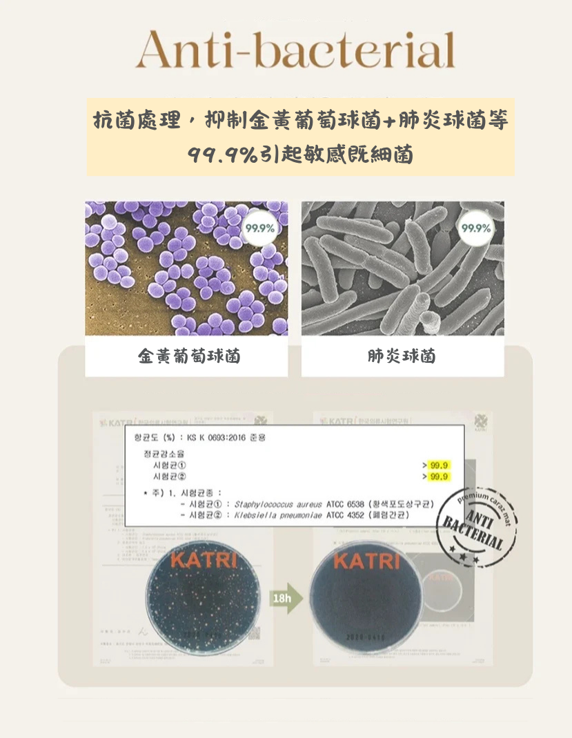 ★ 地墊經過抗菌處理,抑制肺炎球菌+金黃葡萄球菌等99.9%引起敏感既細菌